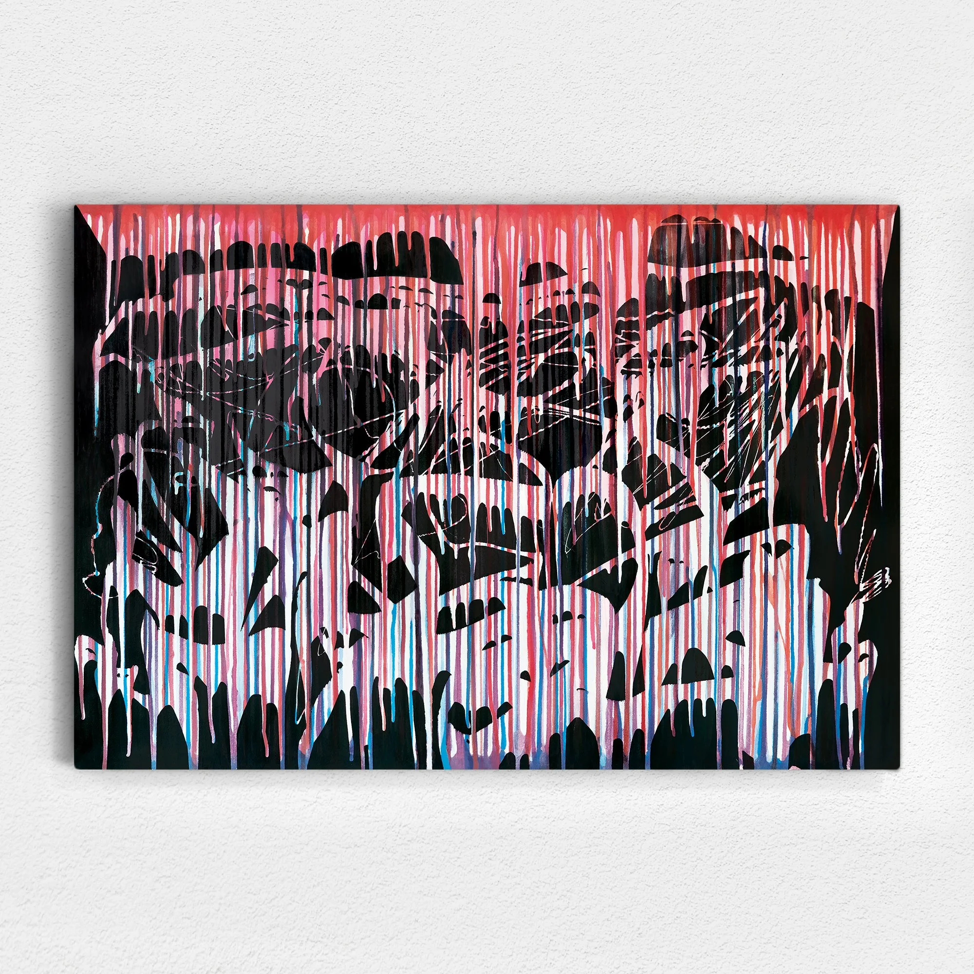 Splashy color and maximum contrast. Watercolor pieces are painted on carefully stretched paper, some with ink accents, other more recent pieces are acrylic on canvas.